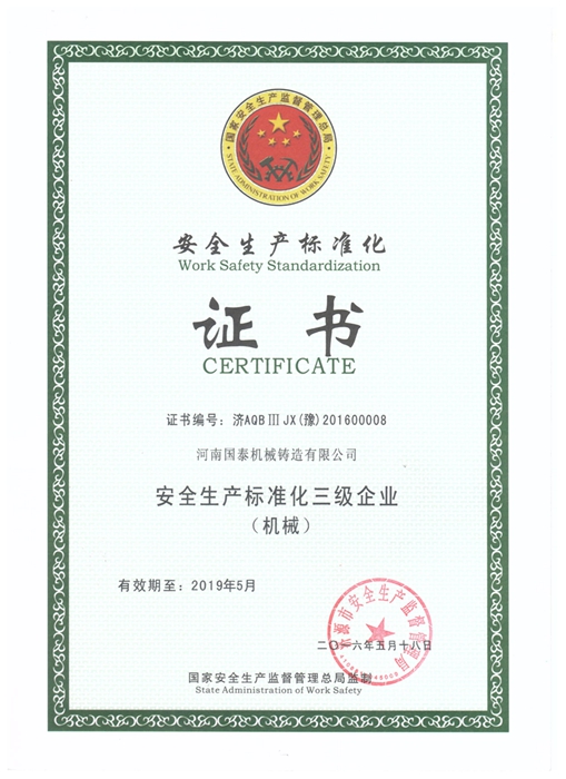 根據國家對企業(yè)安全標準化建設的要求,我公司于去年11月開(kāi)始對已到期的安全標準化進(jìn)行復審工作。在經(jīng)過(guò)前期宣傳發(fā)動(dòng)、對標檢驗整改的基礎上,通過(guò)企業(yè)自評、中介機構考評等程序以及市安監局組織的專(zhuān)家評審驗收和公示后,我公司于2016年5月18日順利完成安全標準化三級復審取證工作,并取得相關(guān)證書(shū)。