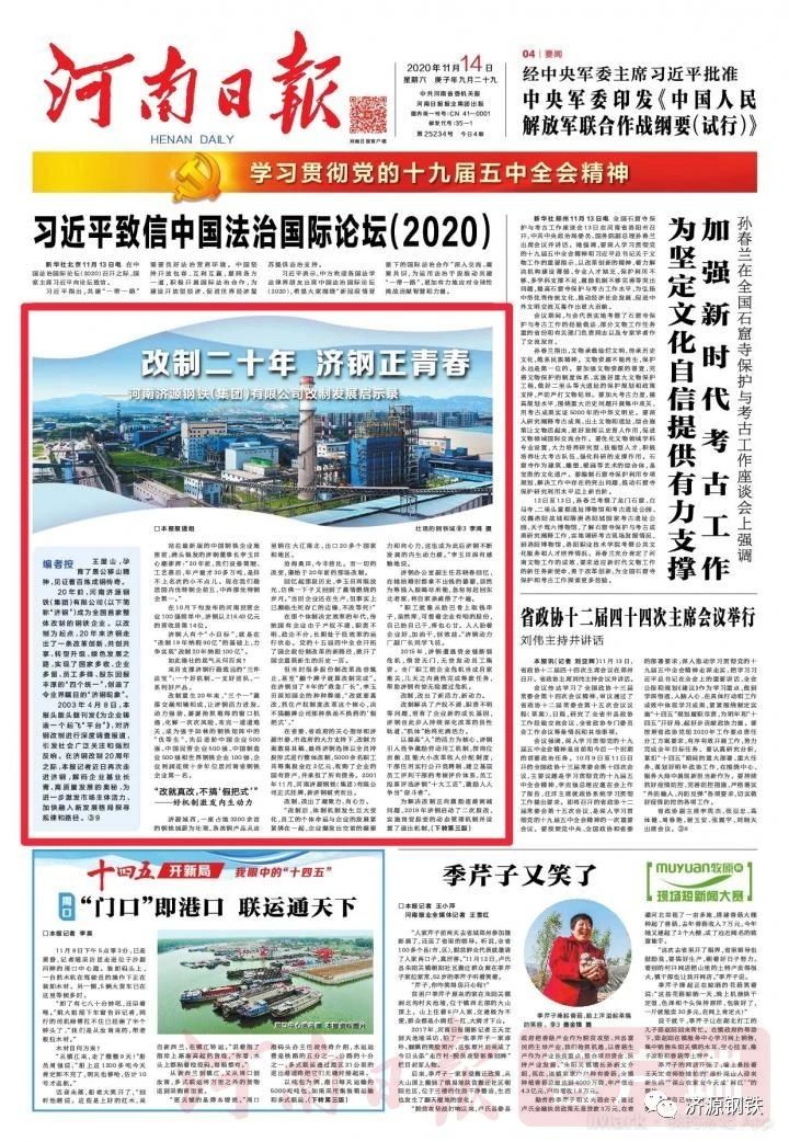 《河南日報》頭版:改制二十年 濟鋼正青春